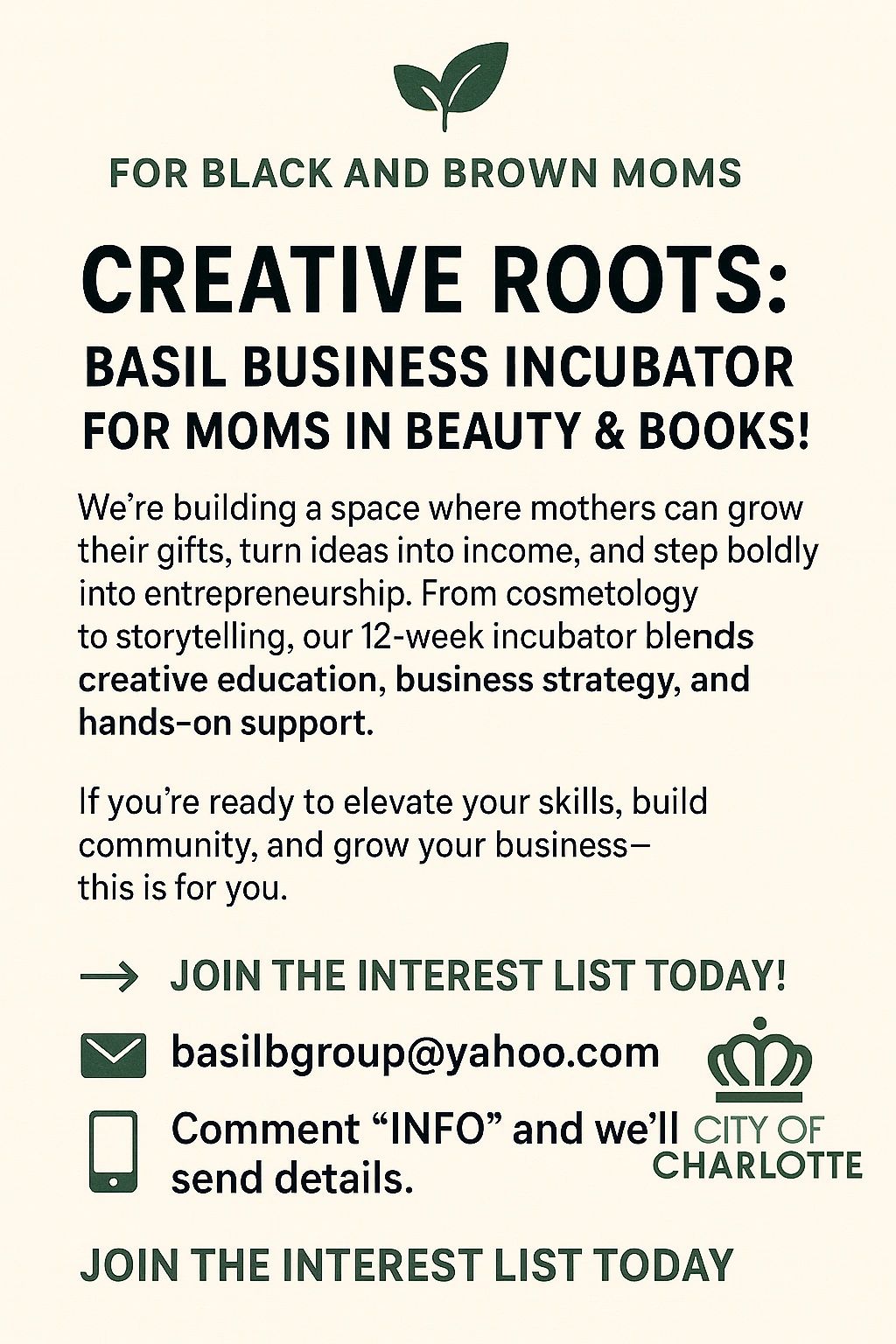 Basil Business Group gratefully acknowledges the support of the City of Charlotte for funding our Creative Roots: Incubator for Moms in Beauty & Books initiative through the Creative Growth Grant Program. This investment helps us continue empowering mothers through creativity, beauty education, and entrepreneurship.